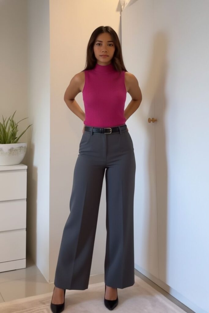 Nada impede que você também possa usar uma blusa mais larguinha, mas lembre-se, não cubra a cintura com a blusa, já que isso vai atrapalhar que a calça desenhe sua silhueta. Uma boa dica para isso é colocar a blusa larga por dentro da calça pantalona e deixar uma pequena folga.