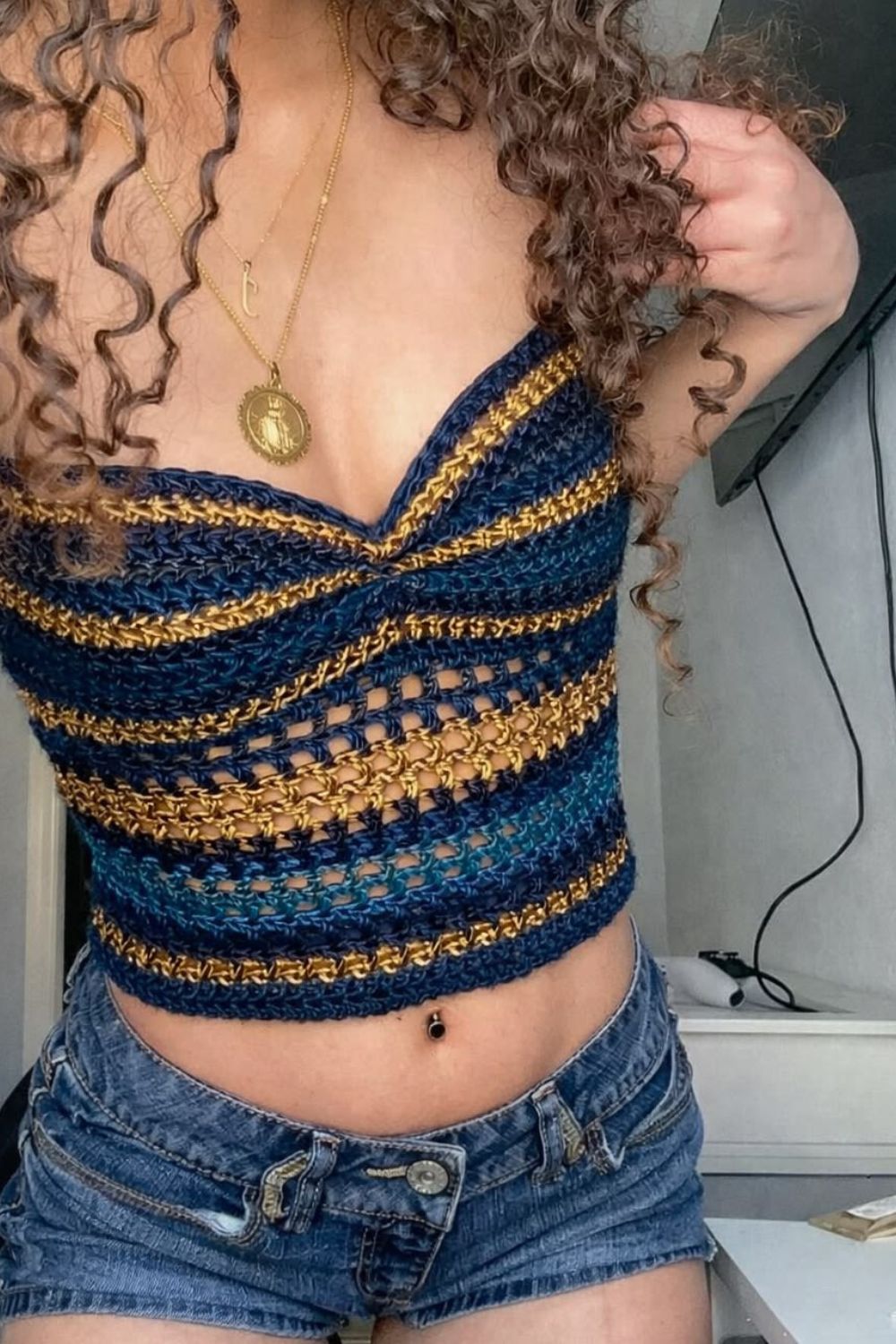 O ponto rede é ideal para criar peças bem fresquinhas. Ele deixa o crop top leve e perfeito para dias quentes. É um modelo muito usado como saída de praia ou look de verão mais ousado.