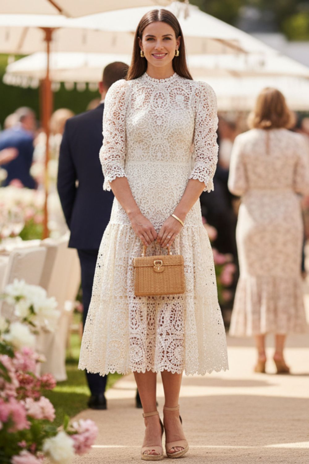 Embora o branco seja o queridinho, o vestido de laise aparece cada vez mais em tons pastel, terrosos e até vibrantes. Azul serenity, rosé e verde oliva são apostas certeiras para quem quer fugir do óbvio.