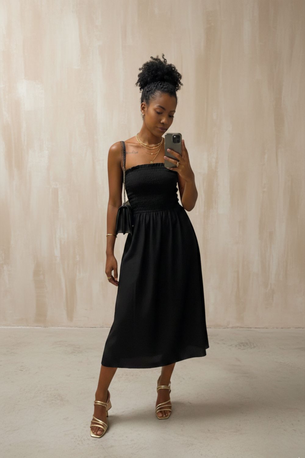O vestido midi básico é uma escolha certeira para quem busca praticidade, elegância e conforto em qualquer ocasião.