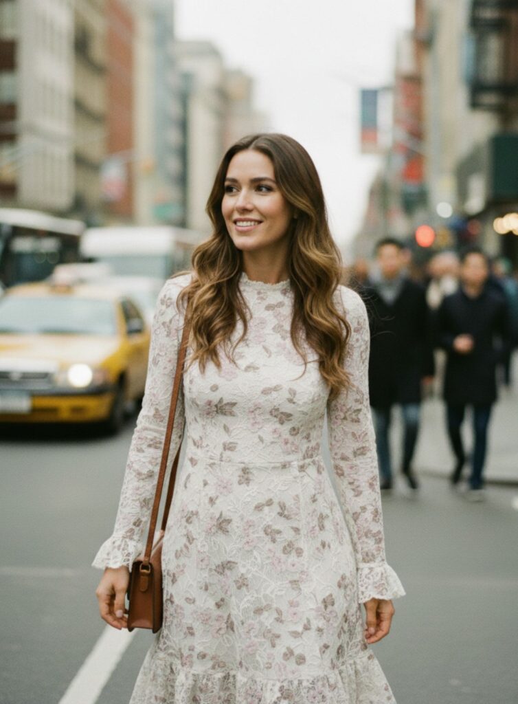 Uma das maiores dúvidas sobre vestidos de renda é como equilibrar o look. A dica é simples: menos é mais. Sandálias neutras, bolsas delicadas e joias discretas deixam o vestido brilhar.