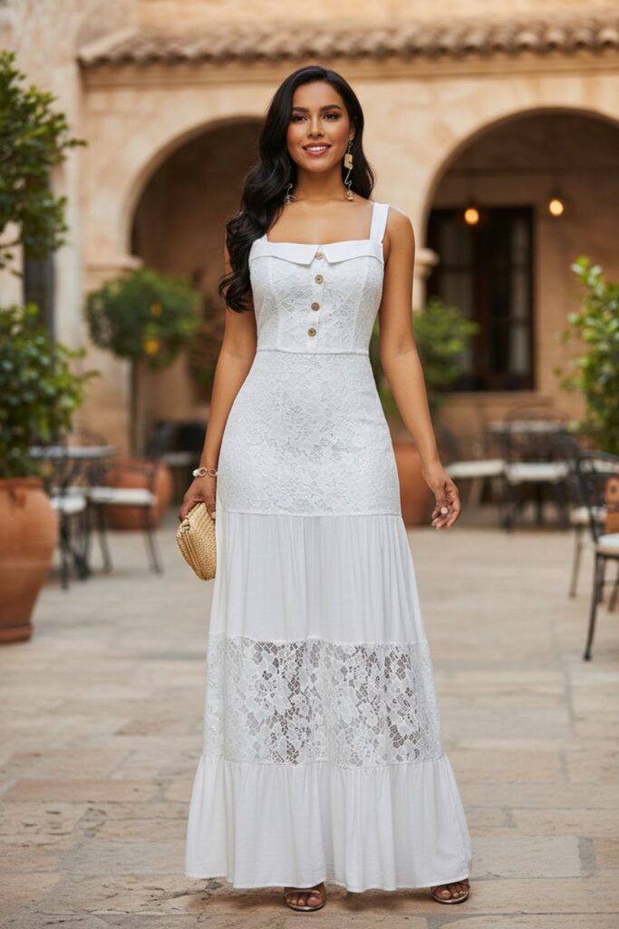 O segredo é escolher um modelo que se ajuste ao seu estilo de vida. Para o dia, vestidos de renda curtos combinam com sandálias e acessórios discretos; à noite, os longos com detalhes sofisticados são perfeitos.