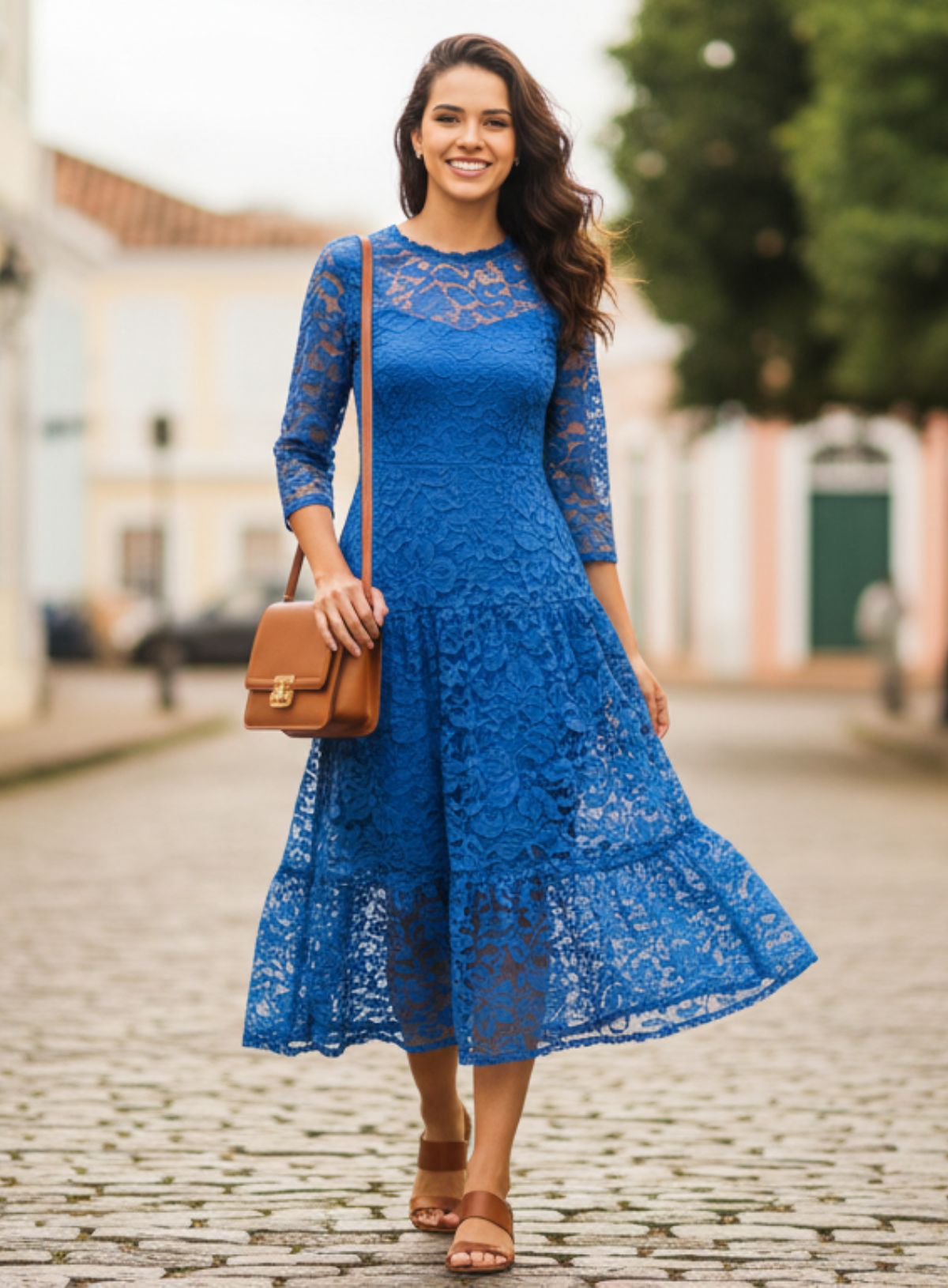 O vestido de renda não é apenas bonito — ele é versátil e feminino, capaz de transformar um look simples em algo encantador. Além disso, a renda proporciona leveza e frescor, ideal para o calor.