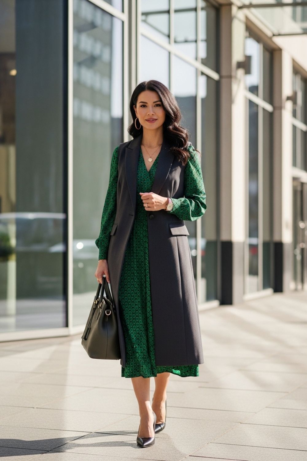 O colete alongado é o segredo para deixar o vestido midi com cara de look planejado. Ele cria linhas verticais que emagrecem e alongam, além de ser uma excelente opção para o ambiente de trabalho.