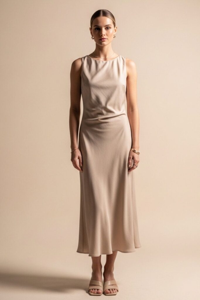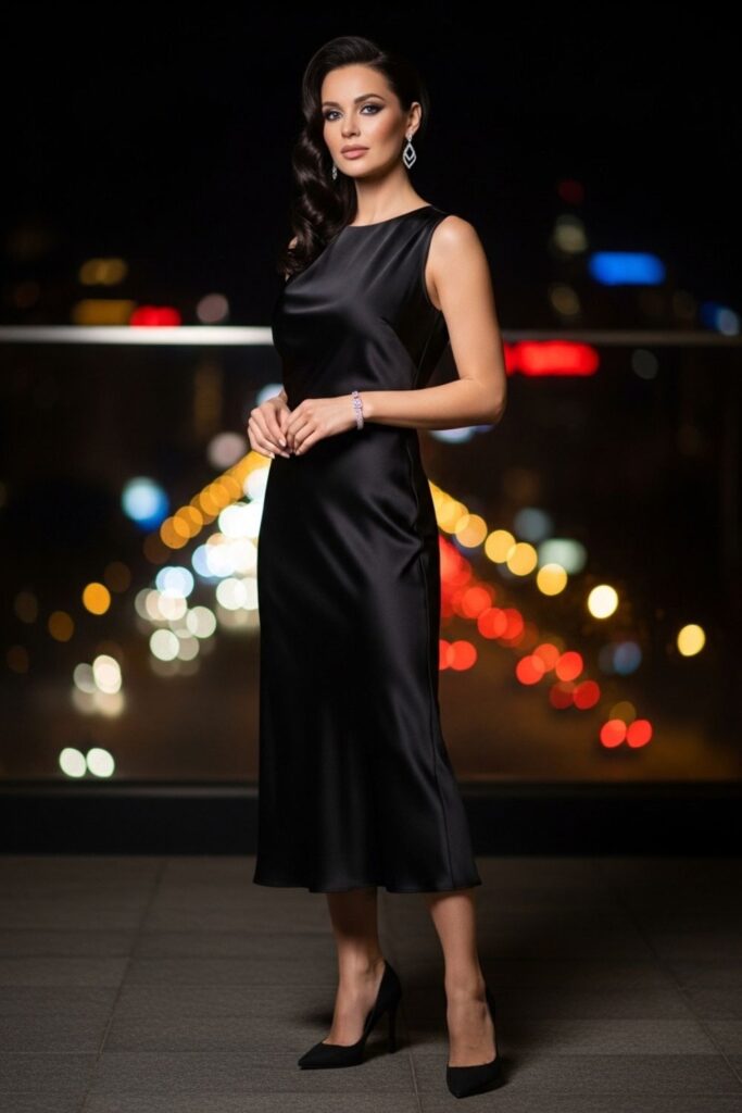 Para a noite, o vestido midi em tecidos acetinados é a escolha certeira. Combine com brincos grandes e um salto fino para elevar o nível do look instantaneamente e brilhar em qualquer festa.