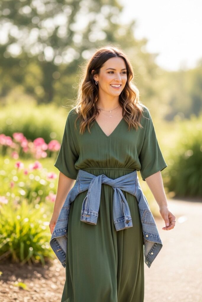 Amarrar uma jaqueta jeans ou de couro na cintura ajuda a definir a silhueta e cria um visual muito estiloso. Essa é uma forma simples de variar o uso do vestido em dias relaxados.